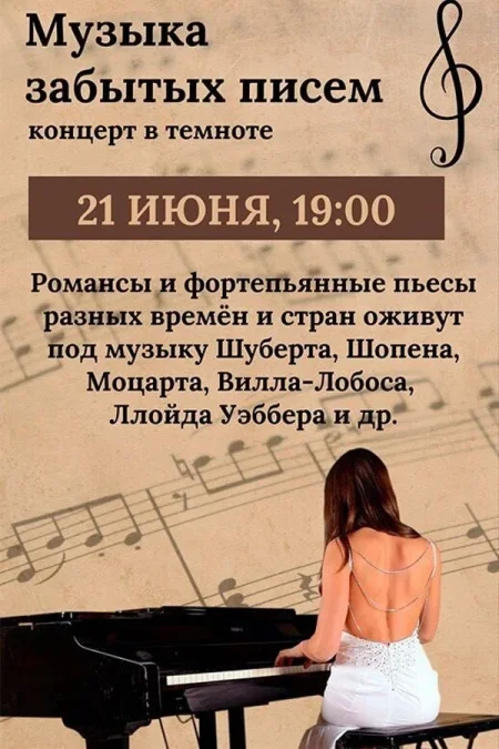 Концерт «Музыка забытых писем» в полной темноте — это концерт-повествование, где старинные романсы, классические фортепианные пьесы и музыка XX-XXI веков сплетаются в одну историю.