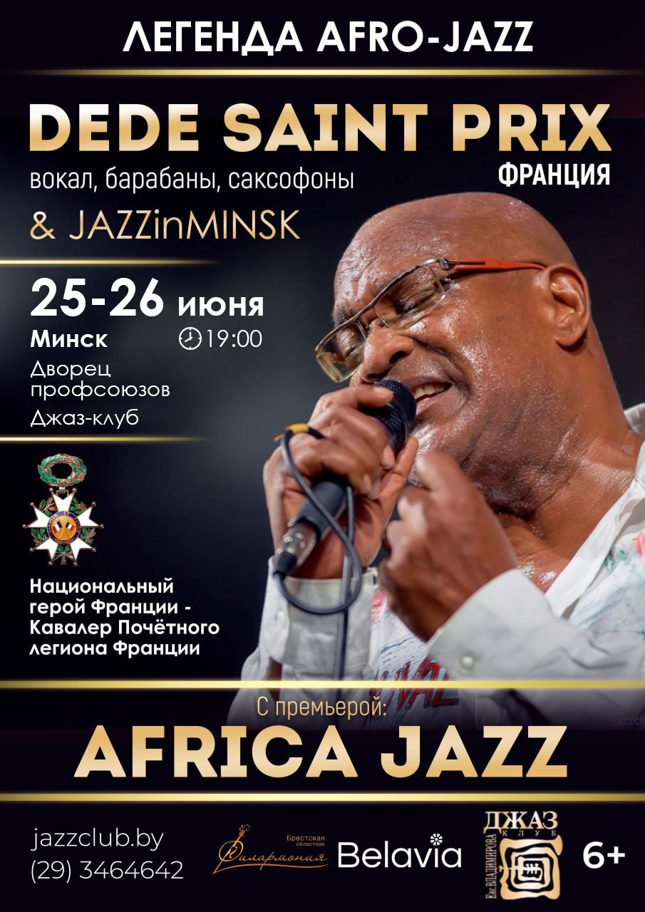 25 Июня в Минске выступит мировая легенда AFRO-JAZZ, Национальный герой Франции — Кавалер Почётного легиона Франции, певец, барабанщик, саксофонист, исполнитель на африканских духовых — DEDE SAINT-PRIX (Париж, Франция).