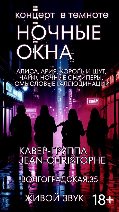 Jean-Christophe сыграют для вас каверы групп Алиса, Ария, Король и Шут, Чайф, Ночные Снайперы, Смысловые галлюцинации, от которых мурашки побегут даже в кромешной тьме.