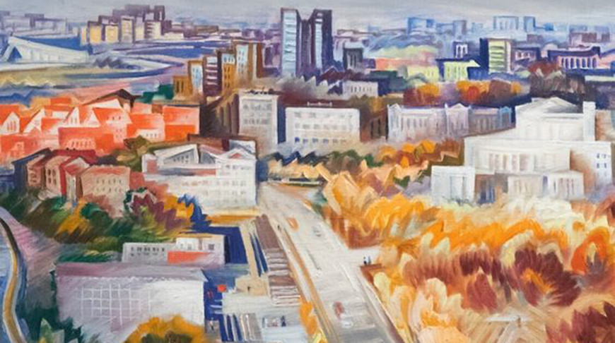 В экспозиции — более 80 произведений живописи и графики: панорамные пейзажи Минска, лиричные акварели, театральные зарисовки и военные мотивы. Работы мастера раскрывают Минск как город мечты, полный света, цвета и движения.