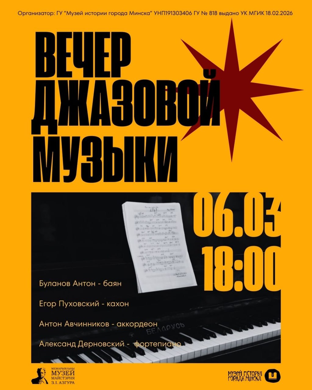 6 марта (пятница) в 18:00 в Мемориальном музее-мастерской З.И. Азгура пройдет концерт «Вечер джазовой музыки»