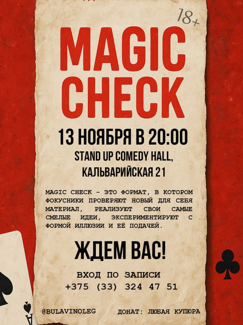 Готовьтесь к вечеру, который перевернет ваше представление об иллюзионном жанре! После успеха 8-го выпуска, команда профессиональных иллюзионистов и любителей фокусов приглашает вас на 9-й Magic Check – уникальный творческий эксперимент, уровень которого растет с каждым разом!