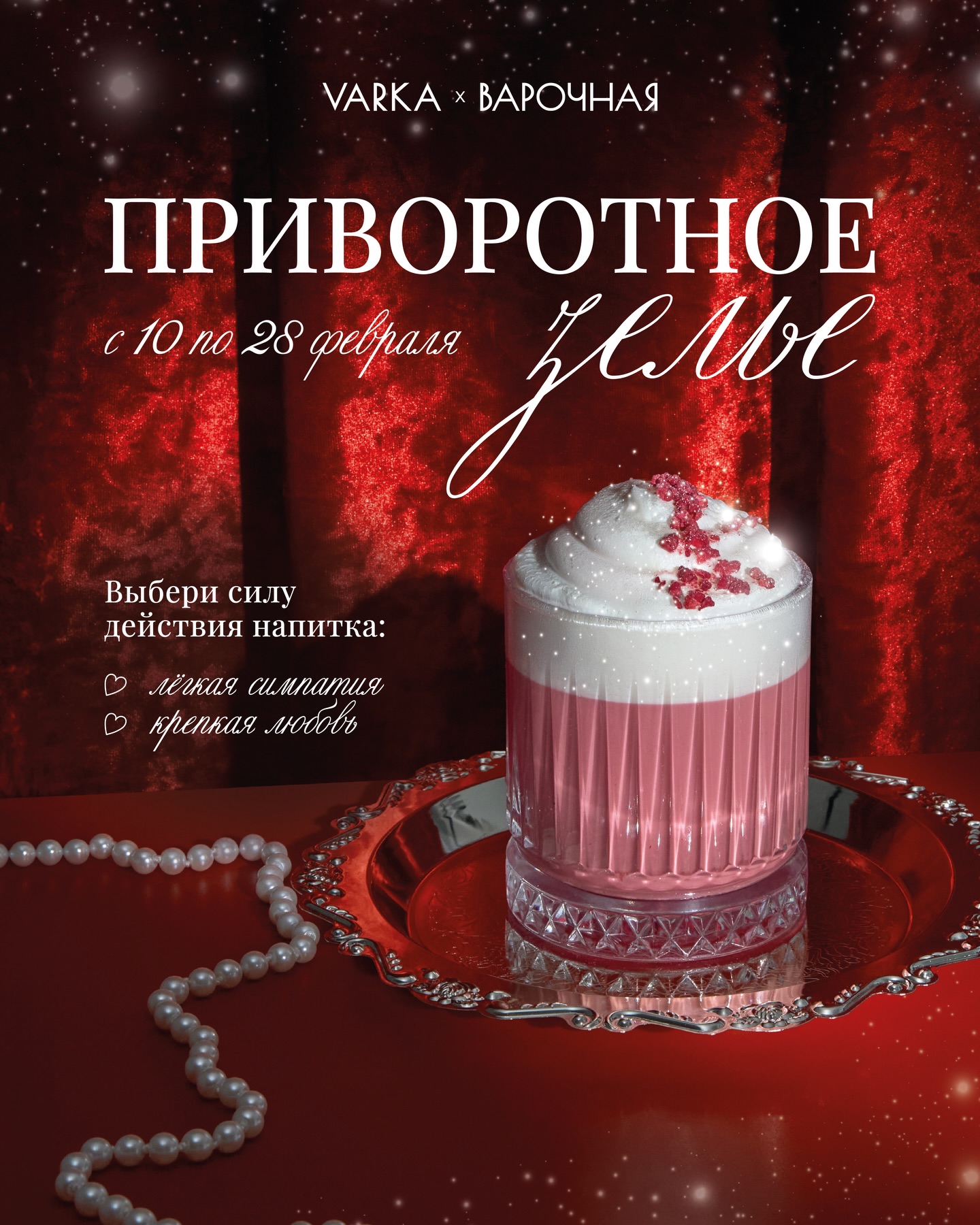 В популярной сети кофеен Varka ко Святого Валентина представили особый напиток «Приворотное Зелье». В его составе — эспрессо, молоко, пюре земляника, сироп бобы тонка, взбитые сливки, сублимированная малина, глиттер, пищевой краситель, приворотный ингредиент — парфюм