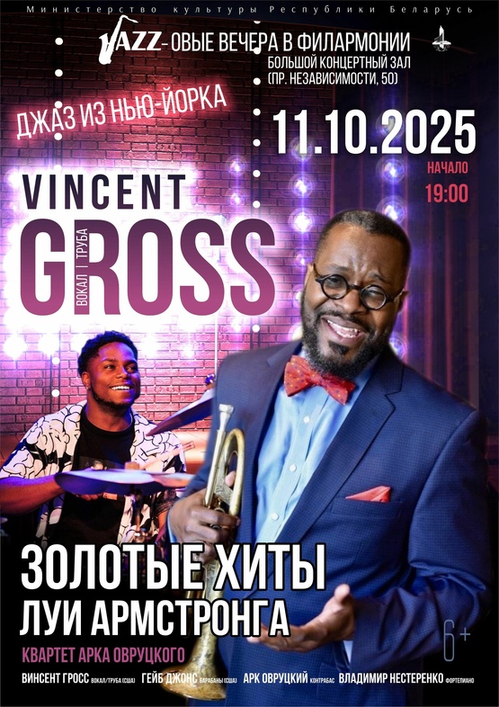 Погрузитесь в атмосферу классического джаза с программой, посвящённой великому Луи Армстронгу. На сцене Белгосфилармонии выступит звёздный состав: уникальный вокалист и трубач Винсент Гросс из Балтимора и барабанщик Гэйб Джонс из Вашингтона. Вместе с международным квартетом Арка Овруцкого они исполнят бессмертные хиты — от “What a Wonderful World” до “Hello, Dolly”. Выпускник Консерватории Пибоди и номинант премии Grammy, Винсент Гросс мастерски сочетает жанры джаза, блюза и соула, обещая вечер, полный выразительных импровизаций.