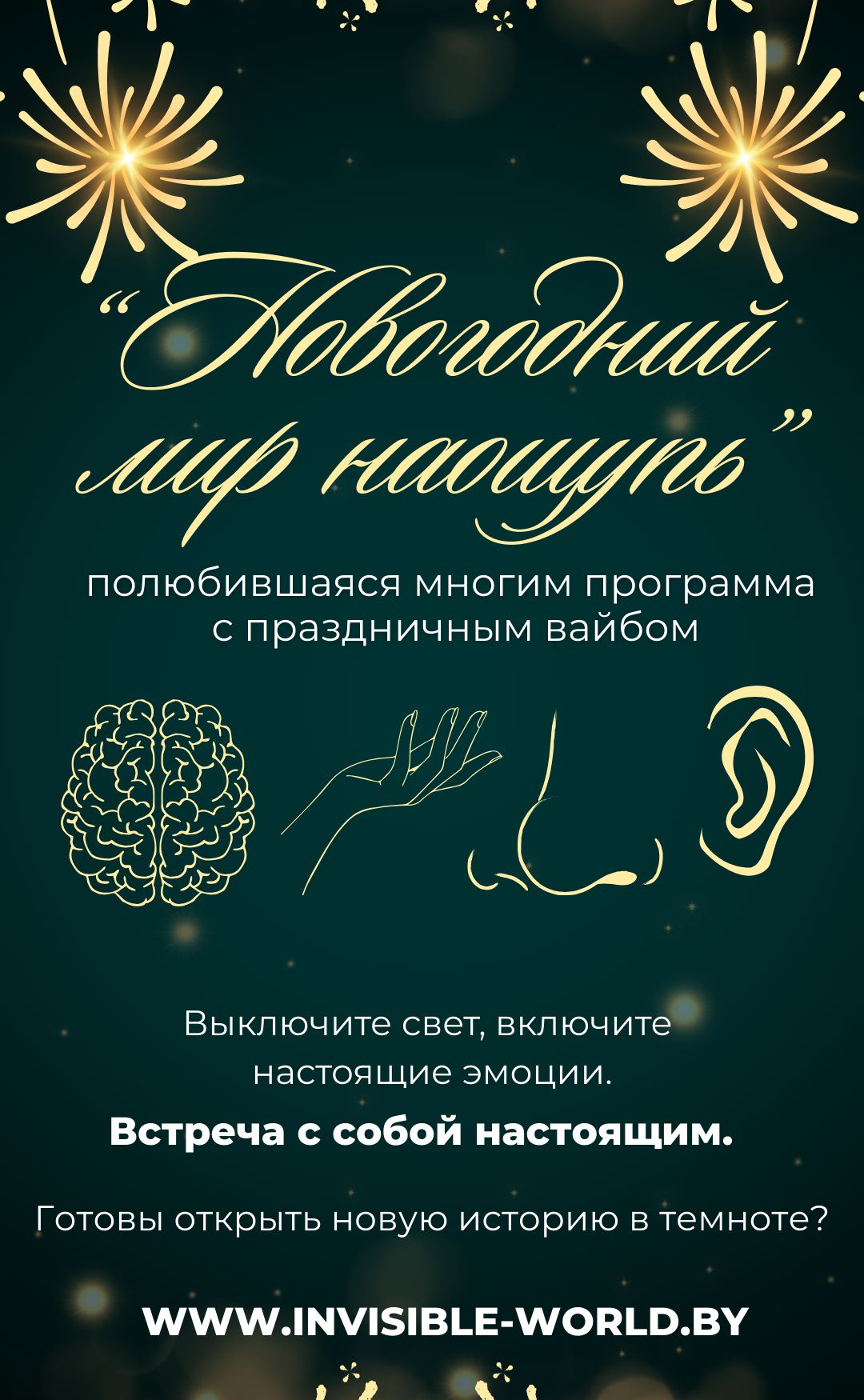 Хотите отдохнуть и насладиться атмосферой незабываемых мероприятий В ТЕМНОТЕ? Центр креативных решений «Невидимый мир» приглашаем вас сделать паузу в предновогодней гонке и познакомиться с миром без визуальных границ. В этом декабре и январе предлагаем погрузиться в мир, где свет гаснет, но чувства обостряются до предела! Приглашаем вас в свою волшебную ТЕМНОТУ. Это уникальный шанс перезагрузиться, открыть себя настоящего и создать по-настоящему незабываемые новогодние воспоминания.