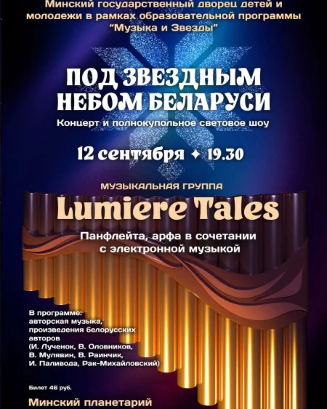 В преддверии Дня города, 12 сентября, Минский Планетарий и группа Lumiere Tales приглашают на уникальную концертную программу «Под звездным небом Беларуси».